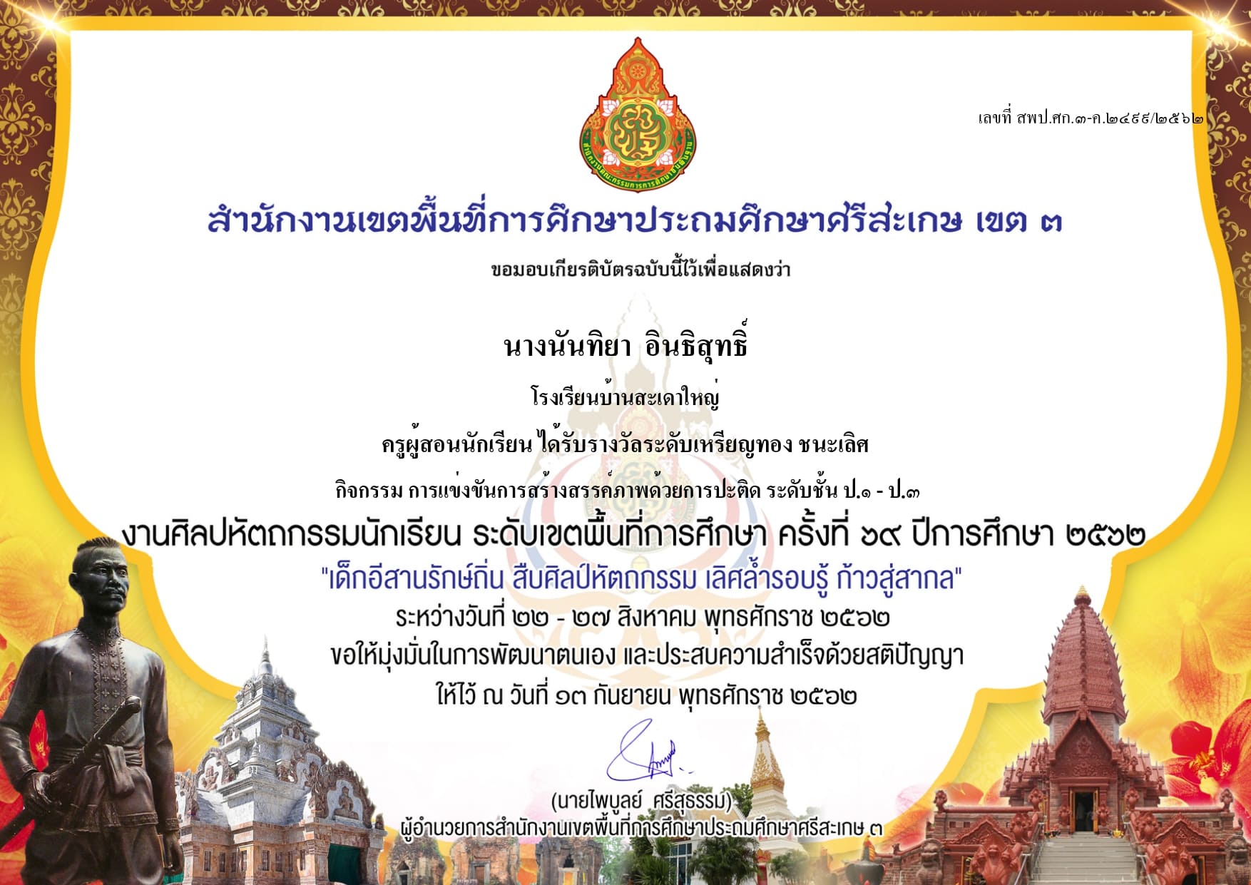 ชื่อผลงาน : ผู้ฝึกสอนนักเรียน ระดับเหรียญทองชนะเลิศ กิจกรรมการแข่งขันการสร้างสรรค์ภาพด้วยการปะติด ระดับชั้น ป.1-3 ระดับเขตพื้นที่การศึกษา ปีการศึกษา 2562