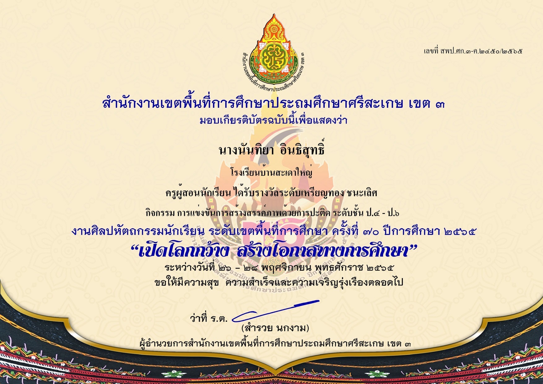 ชื่อผลงาน : ผู้ฝึกสอนนักเรียน ระดับเหรียญทองชนะเลิศ กิจกรรมการแข่งขันการสร้างสรรค์ภาพด้วยการปะติด ระดับชั้น ป.4-6 ระดับเขตพื้นที่การศึกษา ปีการศึกษา 2565