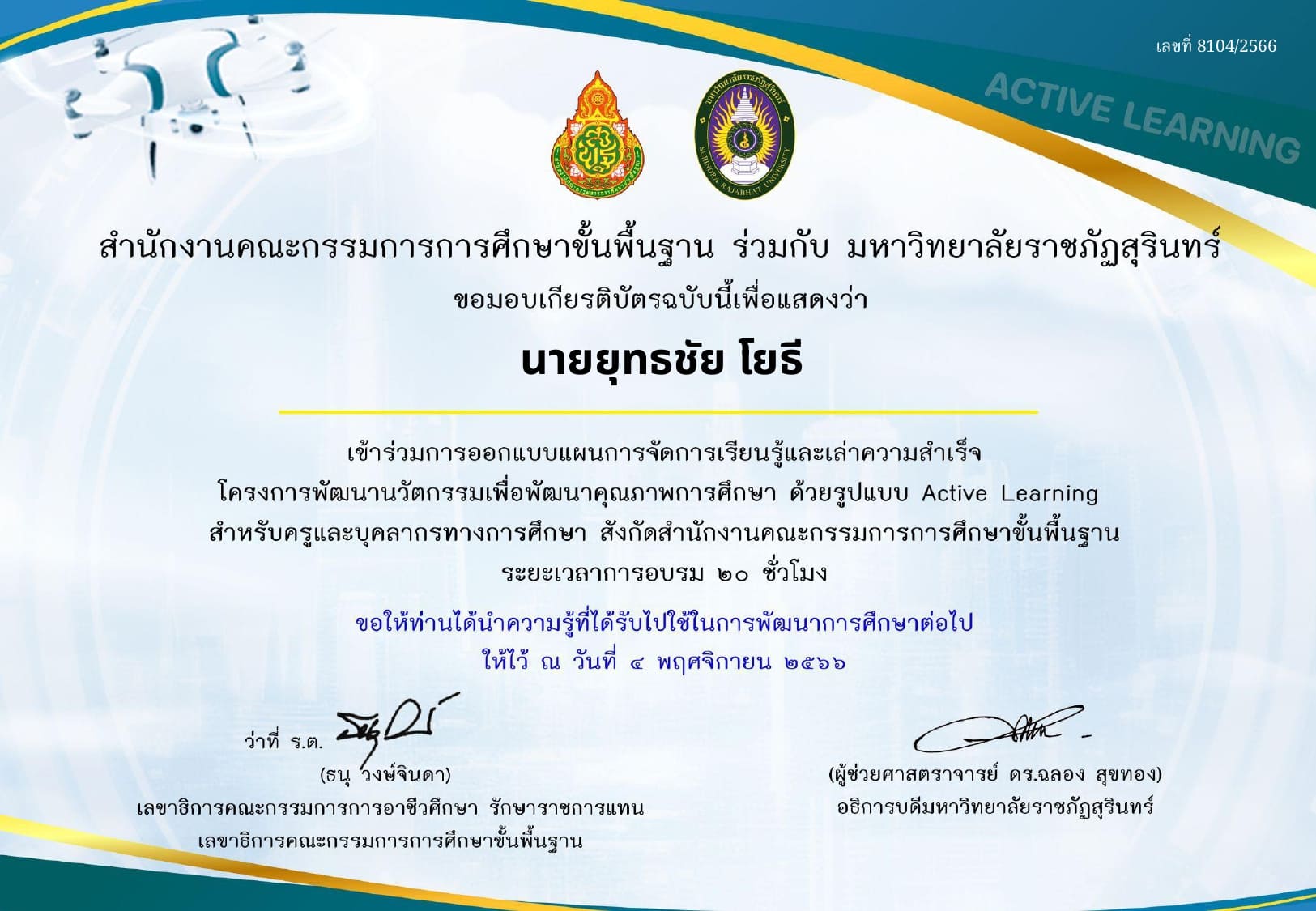 ชื่อผลงาน : เข้าร่วมการออกแบบแผนการจัดการเรียนรู้และเล่าความสำเร็จ โครงการพัฒนานวัตกรรมเพื่อพัฒนาคุณภาพการศึกษา ด้วยรูปแบบ Active Learning