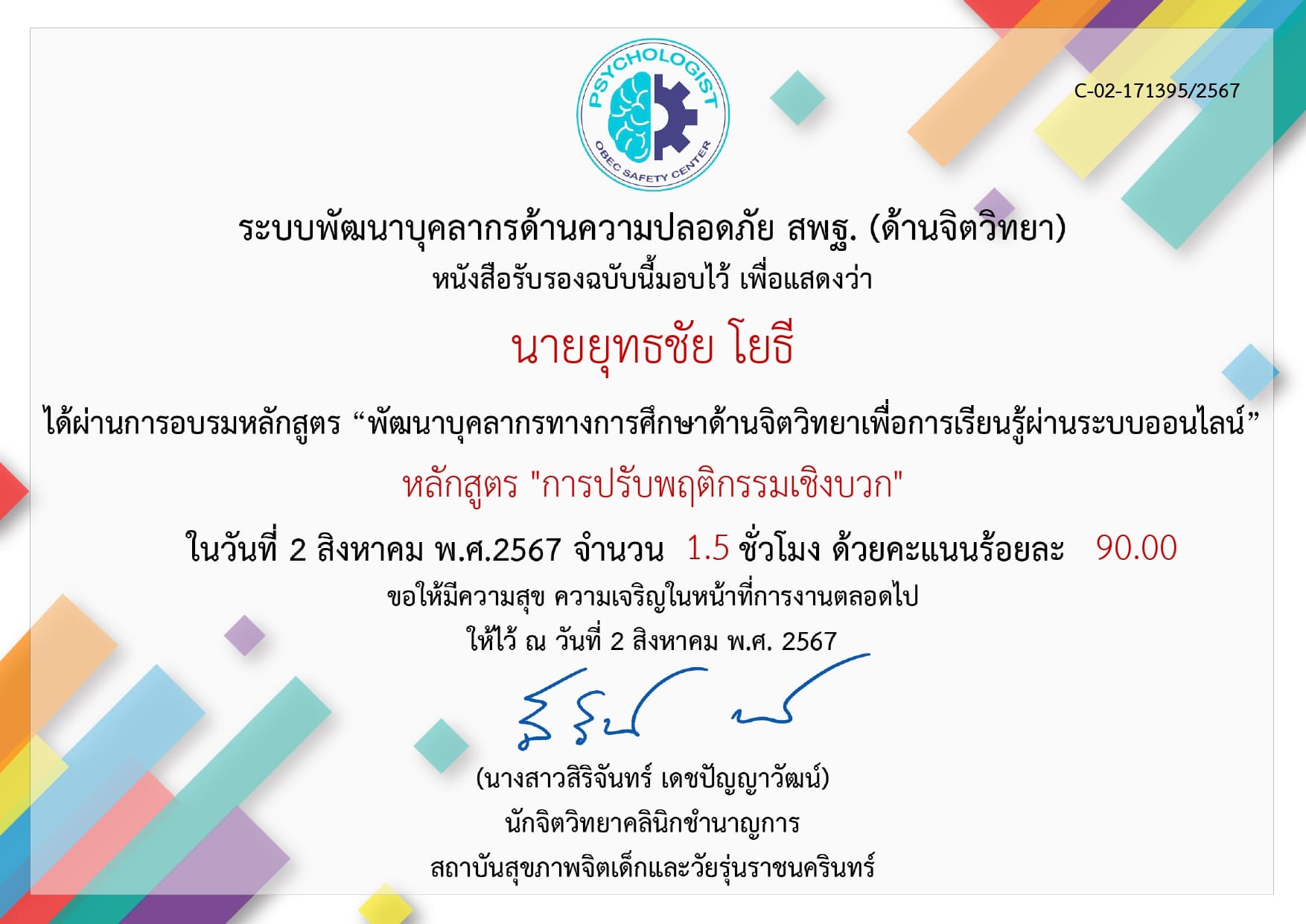ชื่อผลงาน : ผ่านการอบรมหลักสูตร "พัฒนาบุคลากรทางการศึกษาด้านจิตวิทยาเพื่อการเรียนรู้ผ่านระบบออนไลน์" หลักสูตร "การปรับพฤติกรรมเชิงบวก"