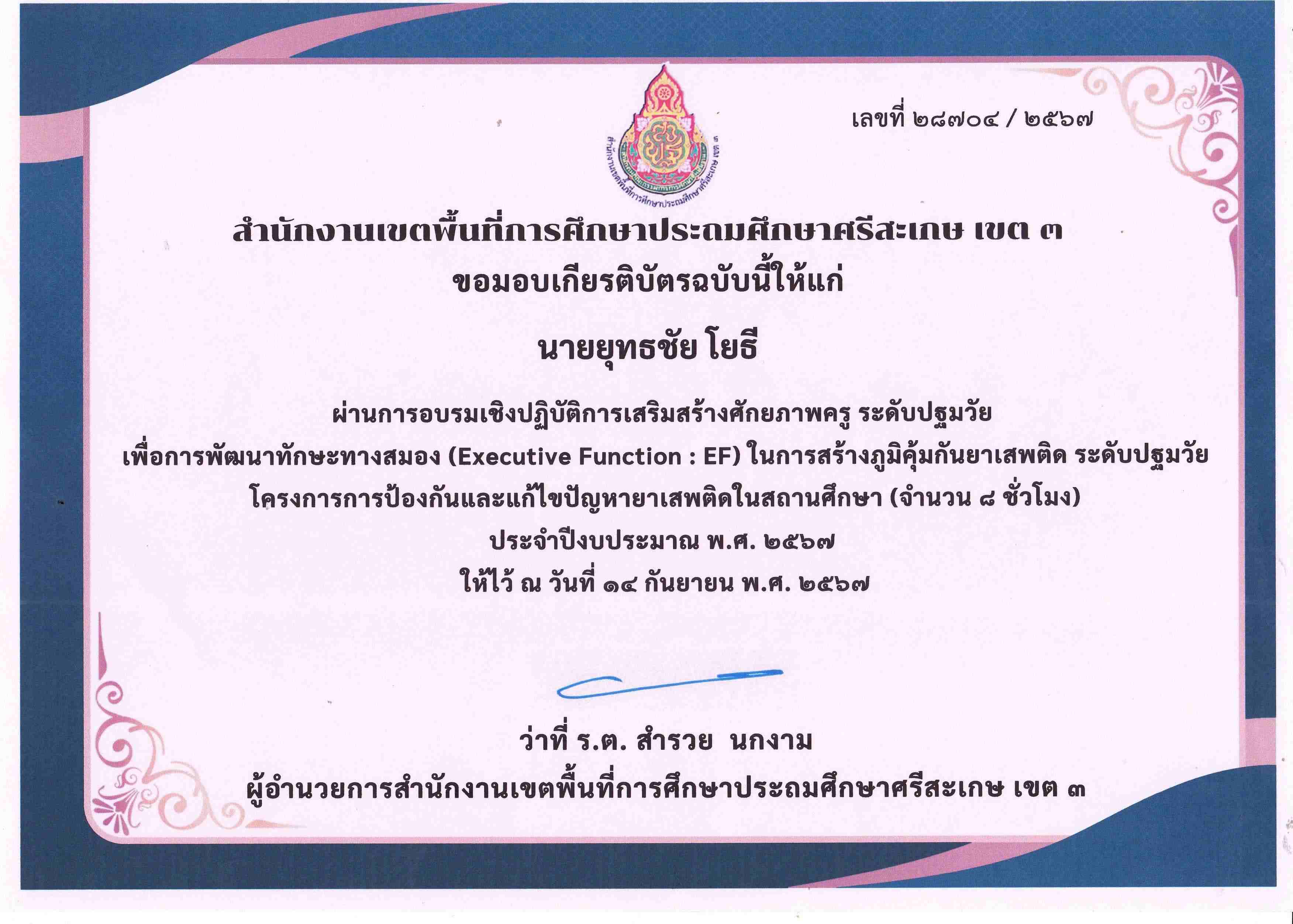 ชื่อผลงาน : ผ่านการอบรมเชิงปฏิบัติการเสริมสร้างศักยภาพครู ระดับปฐมวัย เพื่อการพัฒนาทักษะทางสมอง (Executive Function : EF) ในการสร้างภูมิคุ้มกันยาเสพติด ระดับปฐมวัย