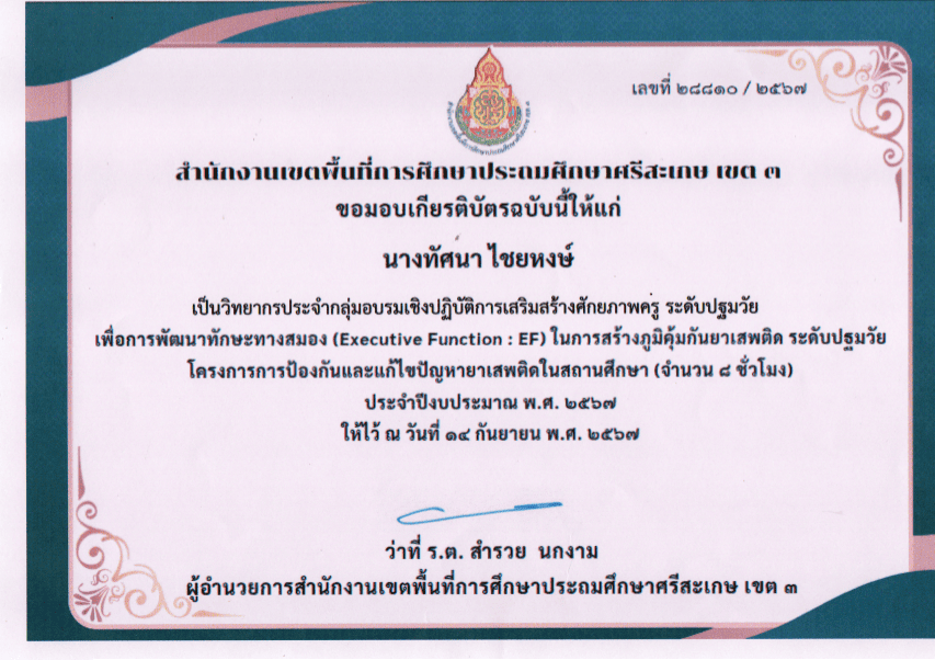 ชื่อผลงาน : วิทยากรอบรมเชิงปฏิบัติการเพื่อการพัฒนาทักษะทางสมอง EF.