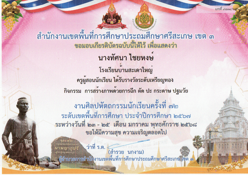 ชื่อผลงาน : ครูผู้สอนนักเรียนได้รับรางวัลระดับเหรียญทอง การสร้างภาพด้วยการฉีก ตัด ปะ กระดาษ