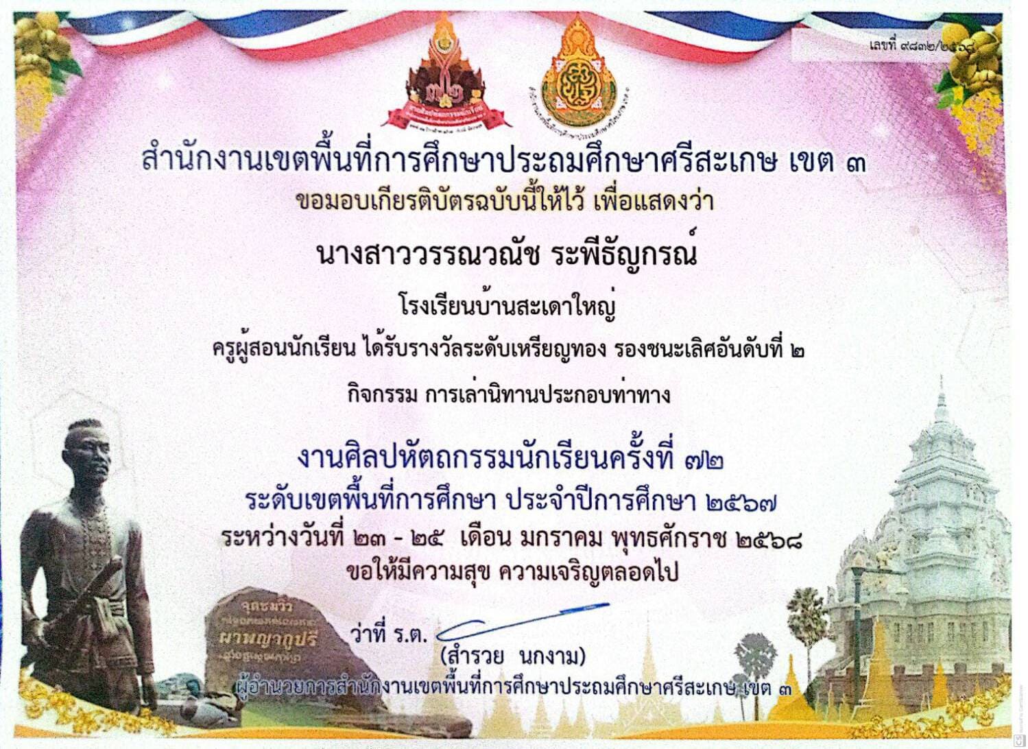 ชื่อผลงาน : ครูผู้สอนนักเรียน ได้รับรางวัลระดับเหรียญทอง รองชนะเลิศอันดับที่ 2 กิจกรรมการเล่านิทานประกอบท่าทาง ปฐมวัย งานศิลปหัตถกรรมนักเรียนครั้งที่ 72/ 2567 ระดับเขตพื้นที่การศึกษา