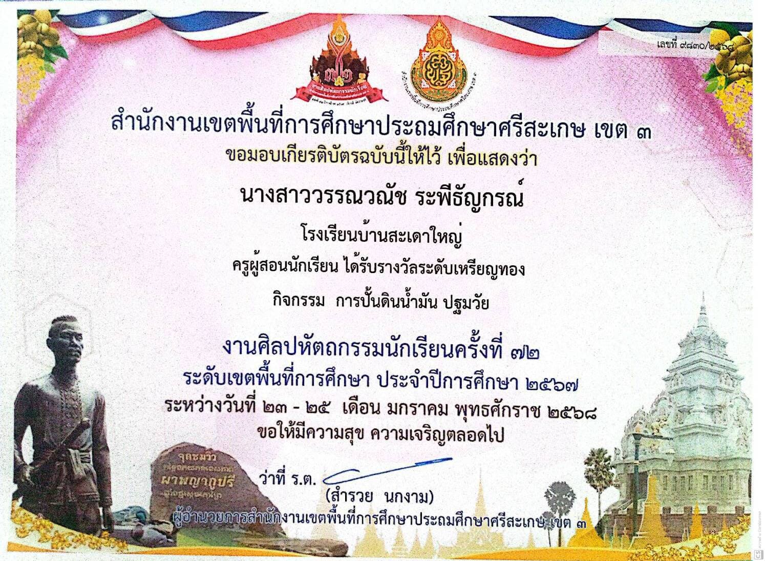 ชื่อผลงาน : ครูผู้สอนนักเรียน ได้รับรางวัลระดับเหรียญทอง กิจกรรมการปั้นดินน้ำมัน ปฐมวัย งานศิลปหัตถกรรมนักเรียนครั้งที่ 72 / 2567 ระดับเขตพื้นที่การศึกษา